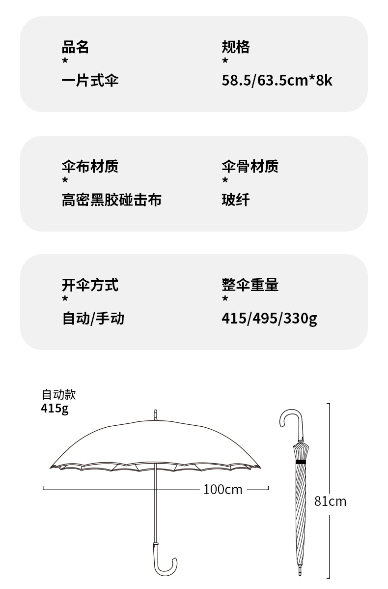 【骨架】:23寸x8kx16骨一片式伞面自动铁中棒纤维伞架